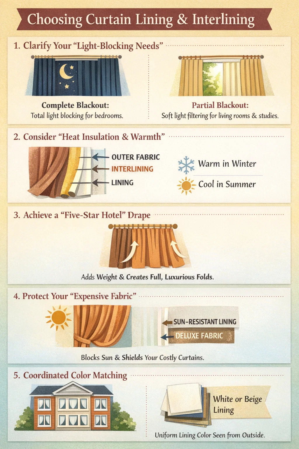 Výber záclonovej podšívky a vlizelín je ako obliecť si záclony do „spodného prádla“ a „vrchného oblečenia“. Vonkajšia látka určuje, ako krásne záclony vyzerajú, zatiaľ čo tieto dve vnútorné vrstvy určujú, ako funkčné a dobre sa zaťahujú.