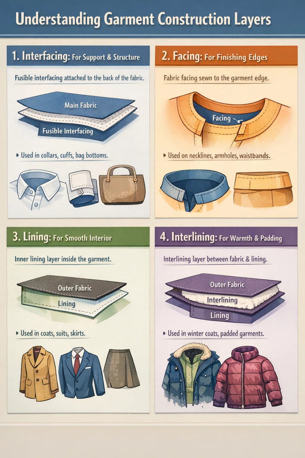 Pri výrobe odevov alebo tašiek môžu tieto štyri koncepty znieť trochu mätúco, ale v skutočnosti sú ako rôzne časti oceľovej výstuže a dekorácie používané pri stavbe domu. Na ich efektívne využitie je kľúčové pochopiť, kde každý „stojí“ v celkovej štruktúre.