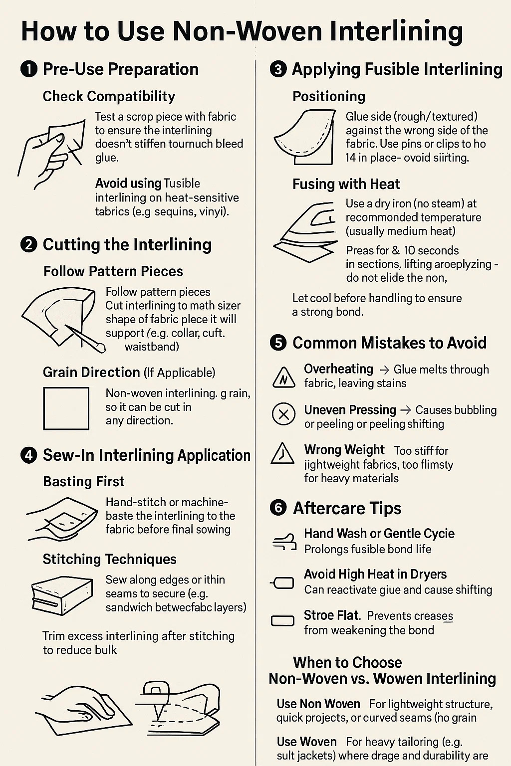 Používajte netkané → na ľahkú štruktúru, rýchle projekty alebo zakrivené švy (žiadne obmedzenia zŕn).