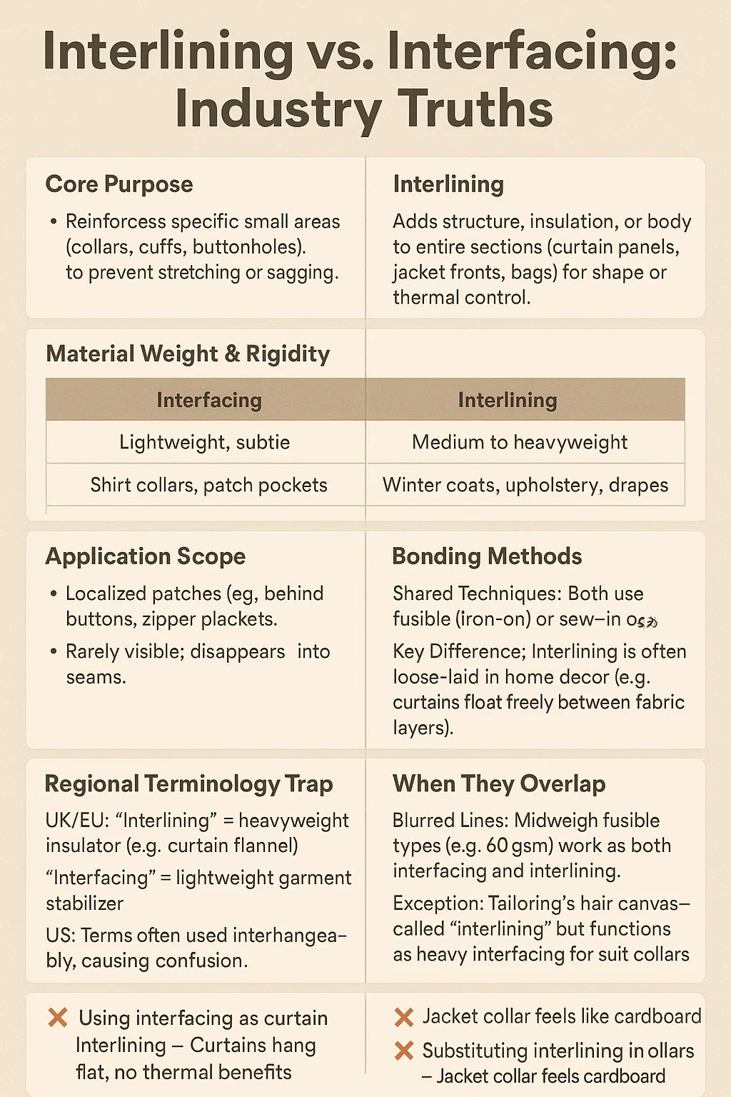 Kľúčový rozdiel: Interlining je často voľný v domácom dekorácii (napr. Závesy voľne vznášajú medzi vrstvami textilu).