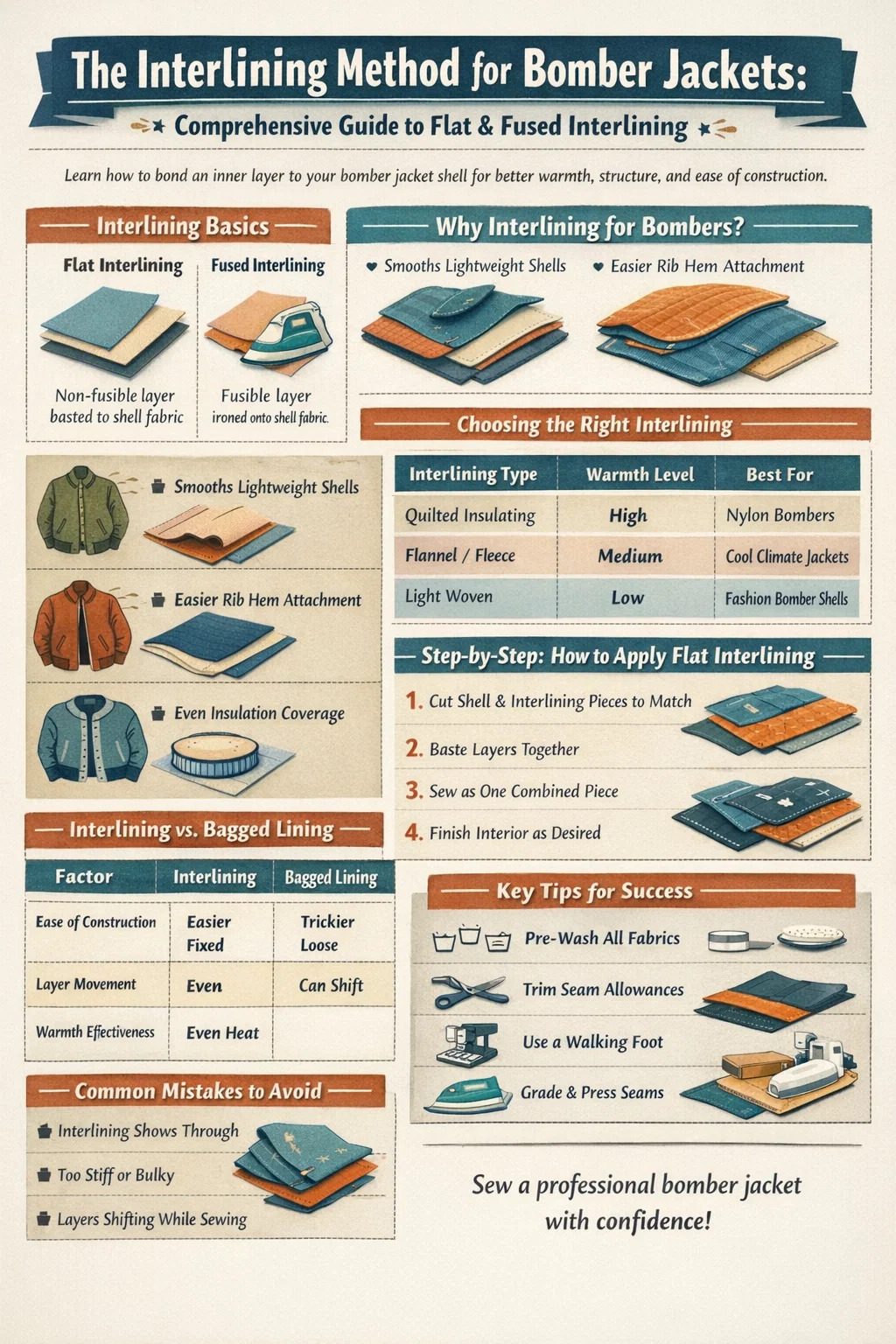 Pre a classic nylon MA-1 style bomber, use a pre-quilted interlining basted flat to each panel — this is both historically accurate and practically sound. Pre a fashion bomber in heavier fabric, a soft flannel or fleece interlining gives excellent results with minimal bulk. For a fully decorative or special-occasion bomber in velvet or brocade, a lightweight underlining keeps the shell fabric supported and reduces distortion at seams and hems without adding any unwanted stiffness.