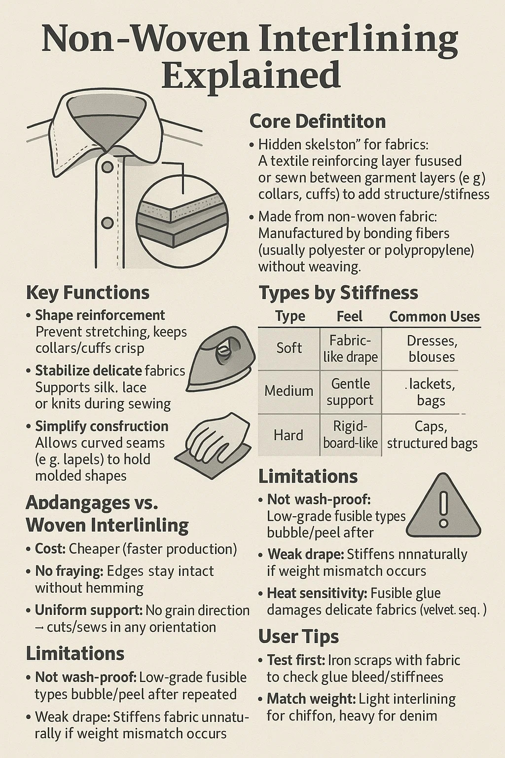 „Skrytá kostra“ pre tkaniny: textilná zosilnená vrstva fúzovaná alebo šitá medzi vrstvami odevov (napr. Golier, manžety) na pridanie štruktúry/tuhosti.